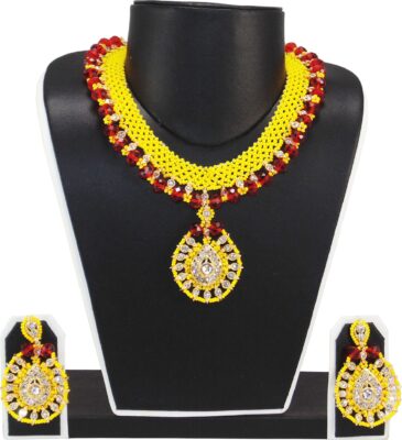 product_specification => Base Material – Crystal , Acrylic , Metal Brand – Fashionvalley Model Number – FV00271 Precious/Artificial Jewellery – Fashion Jewellery Type – Earring and Necklace Set Ideal For – Women Occasion – Wedding and Engagement , Everyday Color – Yellow , Red Chain/Necklace Length – 12.5 inch Weight – 77 g Sales Package – 1 Necklace , 2 Earrings