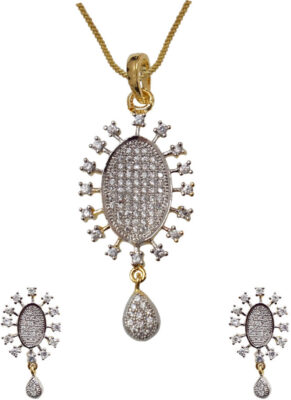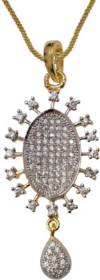 product_specification => Pearl Shape – Natural Pearl Type – NA Pearl Color – NA Base Material – Brass , Alloy Brand – Sheetal Jewellery Gemstone – Zircon Model Number – JCHPS26 Precious/Artificial Jewellery – Fashion Jewellery Plating – Yellow Gold Type – Earring and Pendant Set Occasion – Wedding and Engagement Silver Purity – NA Gold Purity – NA K Chain/Necklace Length – 18 inch Weight – 25 g Sales Package – 1 Pendant , 2 Earrings , 1 Chain Platinum Purity – NA Certification – Brand Certification