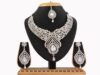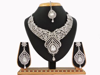 product_specification => Base Material – Alloy Brand – Vatsalya Creation Model Number – 9015 RW Precious/Artificial Jewellery – Fashion Jewellery Plating – Rhodium Type – Necklace , Earring and Maang Tikka Set Ideal For – Women Occasion – Wedding and Engagement Color – White Sales Package – 1 Necklace , 2 Earrings , 1 Maang Tikka