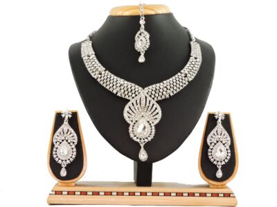 product_specification => Base Material – Alloy Brand – Vatsalya Creation Precious/Artificial Jewellery – Fashion Jewellery Model Number – 5101 RW Plating – Rhodium Type – Necklace , Earring and Maang Tikka Set Occasion – Wedding and Engagement Ideal For – Women Color – White Sales Package – 1 Necklace , 2 Earings , 1 Maang Tikka