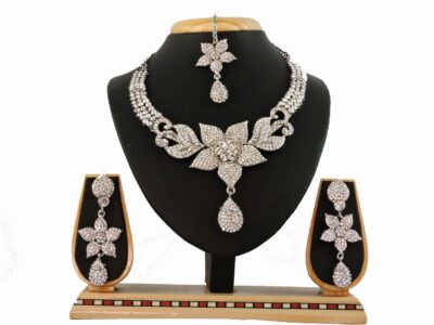 product_specification => Base Material – Alloy Brand – Vatsalya Creation Model Number – 5122 RW Precious/Artificial Jewellery – Fashion Jewellery Type – Necklace , Earring and Maang Tikka Set Model Name – Lilly Ideal For – Women , Girls Occasion – Wedding and Engagement Color – White Sales Package – 1 Necklace , 2 Earings , 1 Maang Tikka
