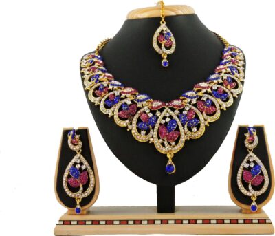product_specification => Base Material – Alloy Brand – Vatsalya Creation Model Number – 9237 RB Precious/Artificial Jewellery – Fashion Jewellery Type – Necklace , Earring and Maang Tikka Set Model Name – Outstanding Ideal For – Women , Girls Occasion – Wedding and Engagement Color – Pink , Blue Sales Package – Necklace , Earings , Maang Tikka