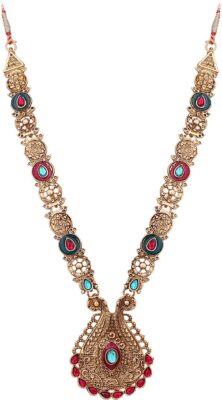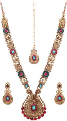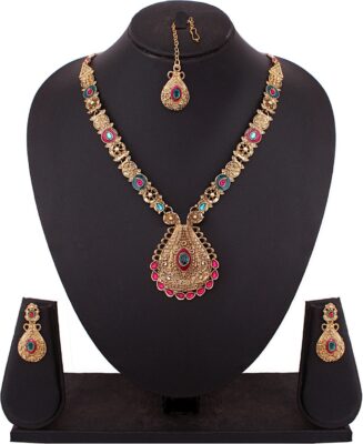 product_specification => Base Material – Brass Brand – Vendee Fashion Precious/Artificial Jewellery – Fashion Jewellery Model Number – VD8637 Type – Necklace , Earring and Maang Tikka Set Occasion – Religious Ideal For – Women Color – Blue , Pink Certification – Brand Certification Sales Package – 1 Necklace , 2 Earrings , 1 Maangtikka