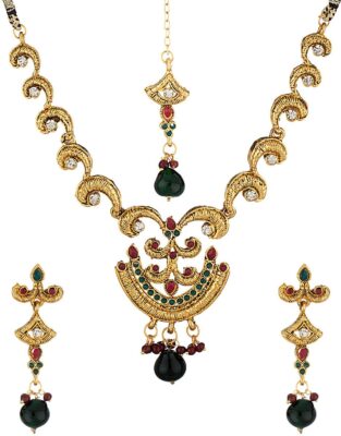 product_specification => Pearl Type – NA Pearl Color – NA Base Material – Alloy Brand – Voylla Gemstone – Zircon Precious/Artificial Jewellery – Fashion Jewellery Model Number – 8907275412175 Plating – Yellow Gold Type – Necklace , Earring and Maang Tikka Set Finish – Textured Occasion – Wedding and Engagement , Everyday , Workwear Ideal For – Women Color – Gold Warranty Summary – The product is covered under 30 days Replacement Guarantee. Chain/Necklace Length – 24.5 inch Weight – 80.78 g Gold Purity – NA K Certification – NA Sales Package – 1 Necklace , 2 Earrings , 1 Maang Tikaa